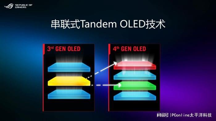 ROG超杀27 Pro二代电竞显示器采用了串联式Tandem OLED技术,将发光层从三层拆分为四层,将黄色层拆分为两个独立的红色层和绿色层从亮度、色彩与OLED寿命,全方位得到了大幅提升。