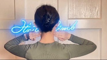 双手手指并拢放在发际线偏下一点的位置,想象脖子后侧的软组织像柔软好塑型的橡皮泥,双手向颈部中线移动时上段颈椎缓缓抬头,双手回到初始位置时微微低头,幅度不用太大(图中为了展示清楚,幅度会偏大一些)。