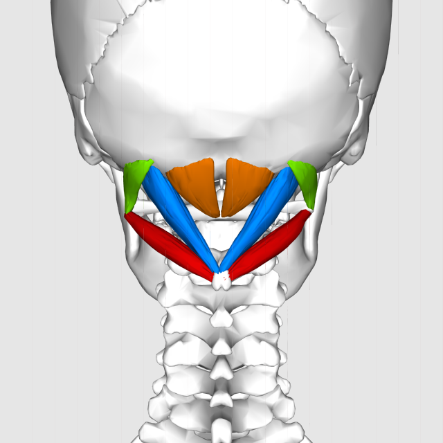 (💡一个小实验,就可以感受到枕下肌群:手指并拢,用两到三成力轻轻按住后脑勺下方、枕下肌群的区域;闭上眼后快速转动眼球,就能感受到枕下肌群也会随着眼球的转动而运动)