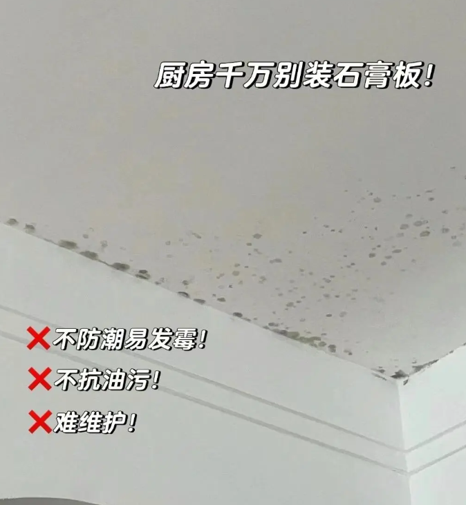 厨房虽然不潮湿,不用担心发霉,可是石膏板不耐脏啊,时间长了之后,油烟全都凝固在吊顶上,清洁起来也麻烦。