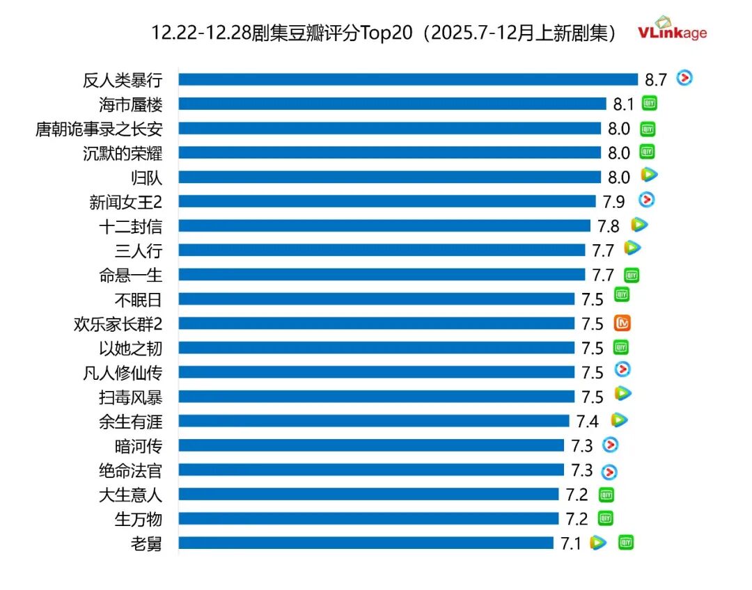 下图为上周剧集豆瓣评分Top20,《海市蜃楼》豆瓣评分8.1分进入榜单,成为今年下半年口碑第二名。《反人类暴行》上周豆瓣评分持续上涨,停留在8.7分,是今年口碑最佳的作品。《老舅》则口碑严重下滑,从7.6分下滑至7.1分,差点跌出榜单。